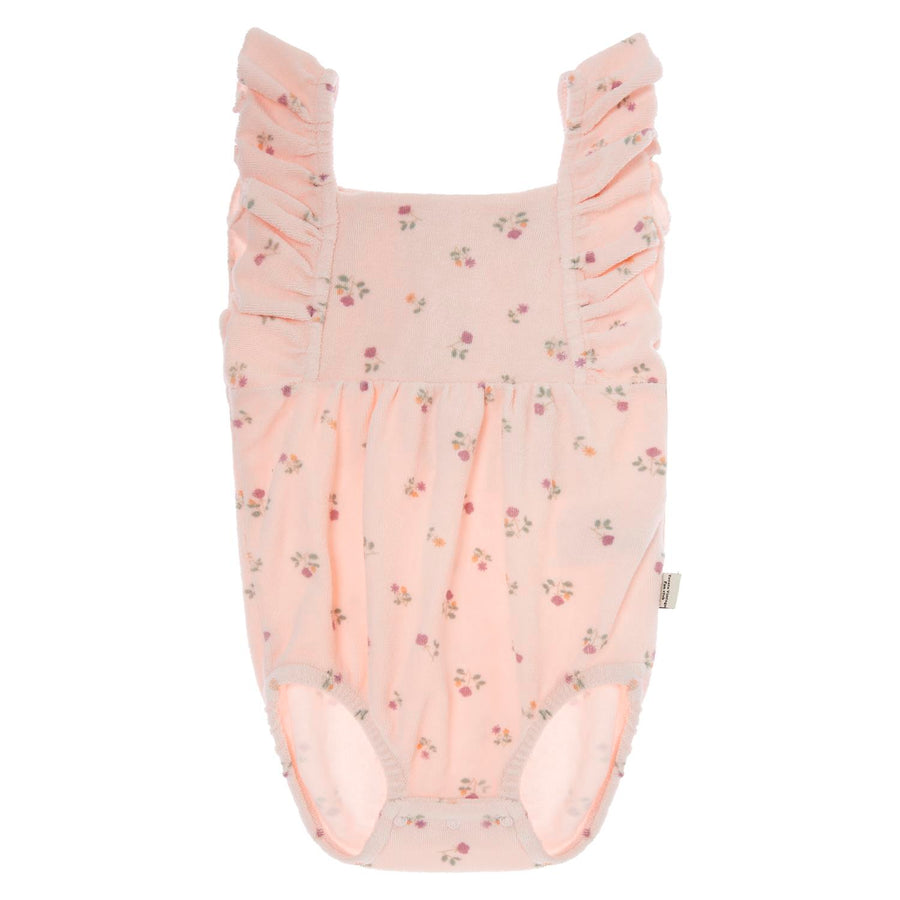 Terrycloth romper with floral pattern throughout. Ruffled detail. Opening at bottom and back for easy dressing, Composition: 100% cotton.